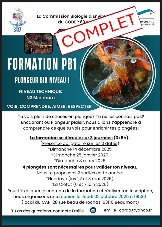Cette année la Commission Biologie & Environnement du CODEP63 a le plaisir de vous annoncer l'ouverture d'une formation PB1 Plongeur Bio Niveau1.