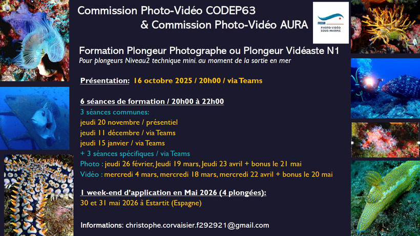 Photo-Vidéo (AURA) de la FFESSM, organise les formations de Plongeur Photographe Niveau1 et de Plongeur Vidéaste Niveau1.